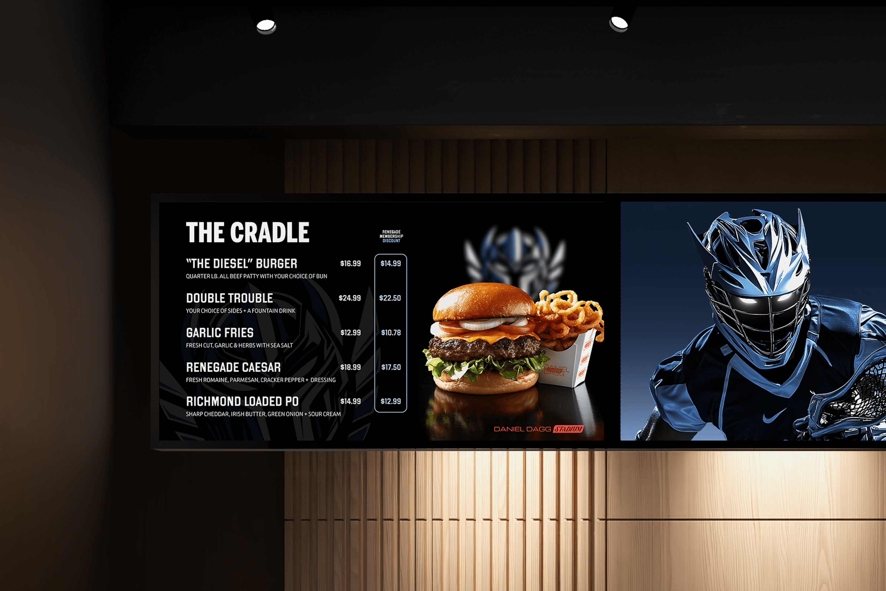 A concession-led digital menu system designed to improve speed, clarity, and consistency on game days. Screen layouts were optimized for high-traffic decision-making, while supplemental displays addressed common stadium challenges such as queue management, out-of-stock updates, and directional clarity across concourses.